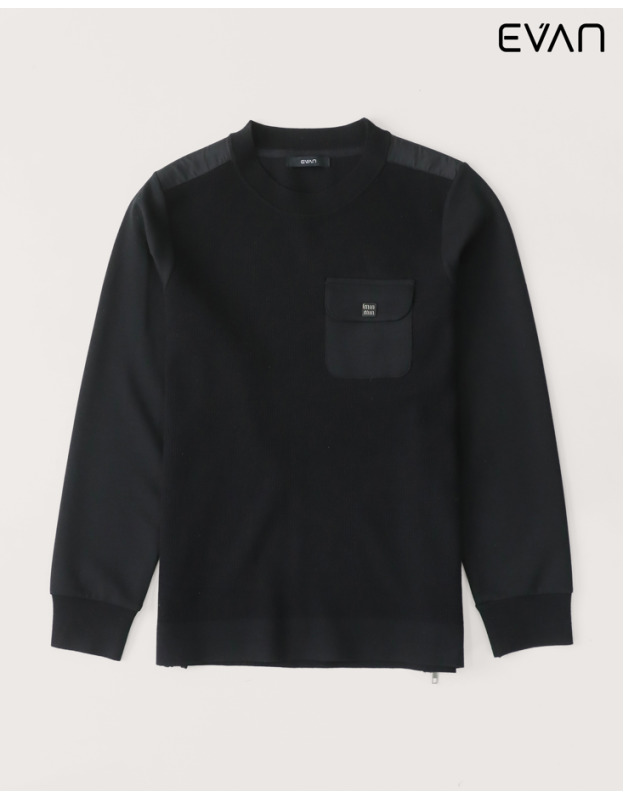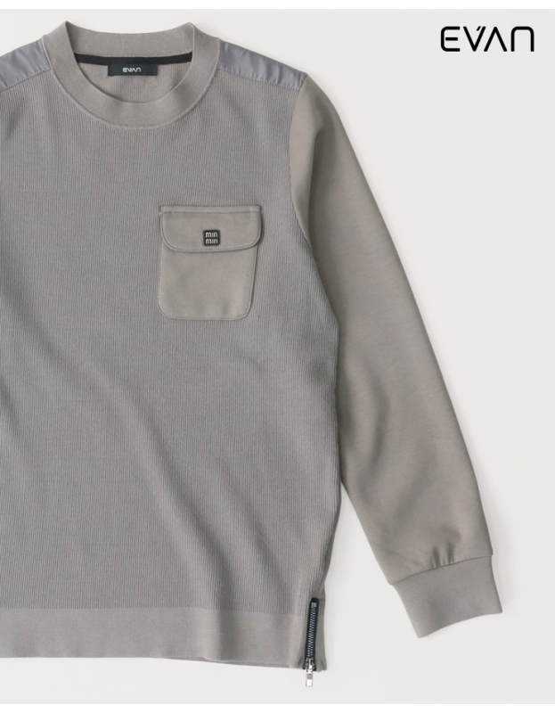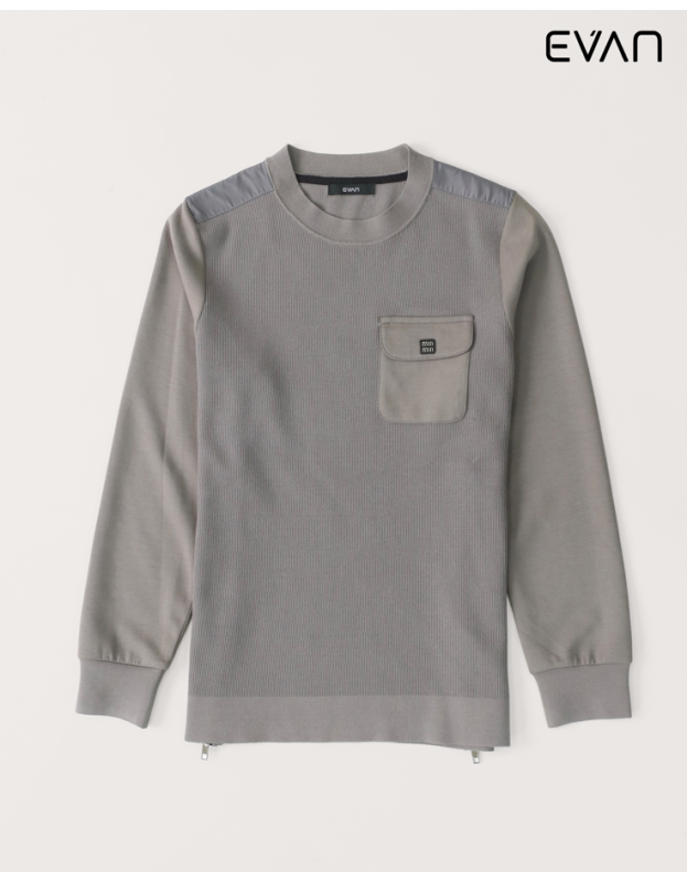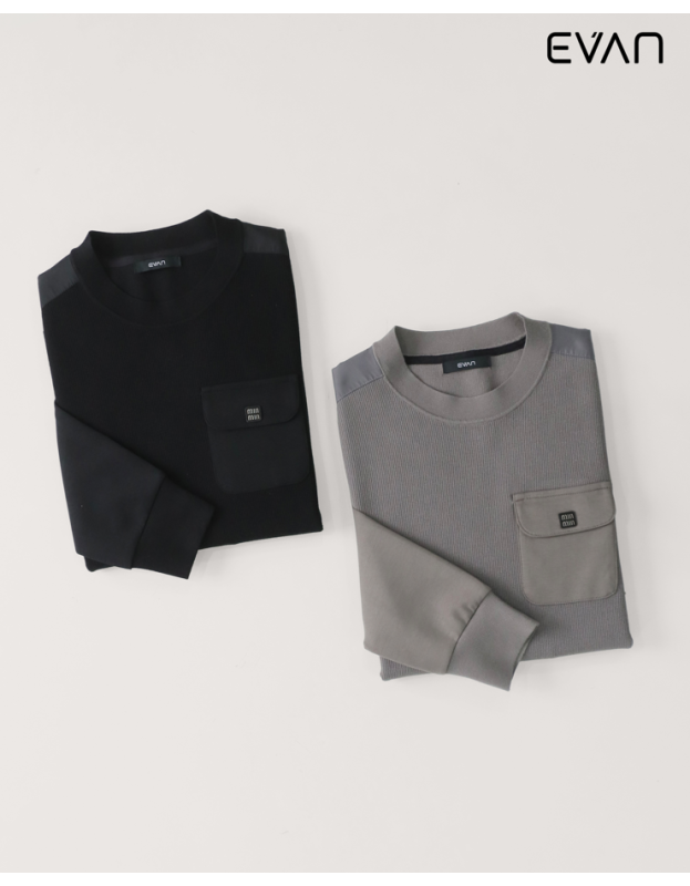Elevate your casual layering with the Utility Pocket Crewneck, a modern piece that blends comfort with military-inspired details. This long-sleeve top features a soft, textured knit on the torso, subtly contrasted with smooth panels on the shoulders and sleeves. The key detail is the stylish button-flap utility pocket on the chest, along with a functional small zipper detail near the hem for a contemporary finish. Available in two essential colors, a versatile gray and a classic black, this top is an easy way to add sophistication and functional style to your everyday look.